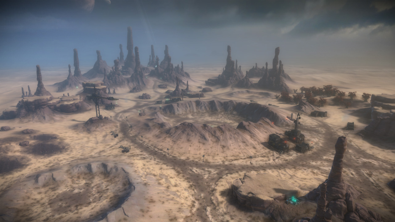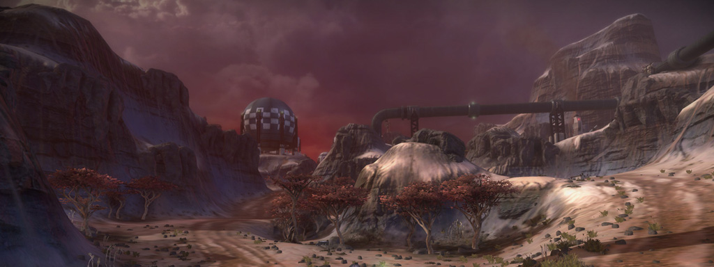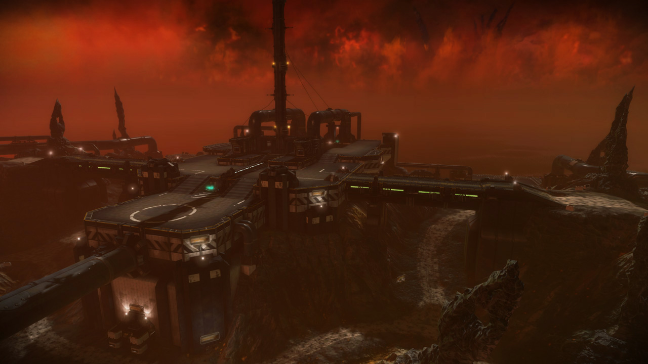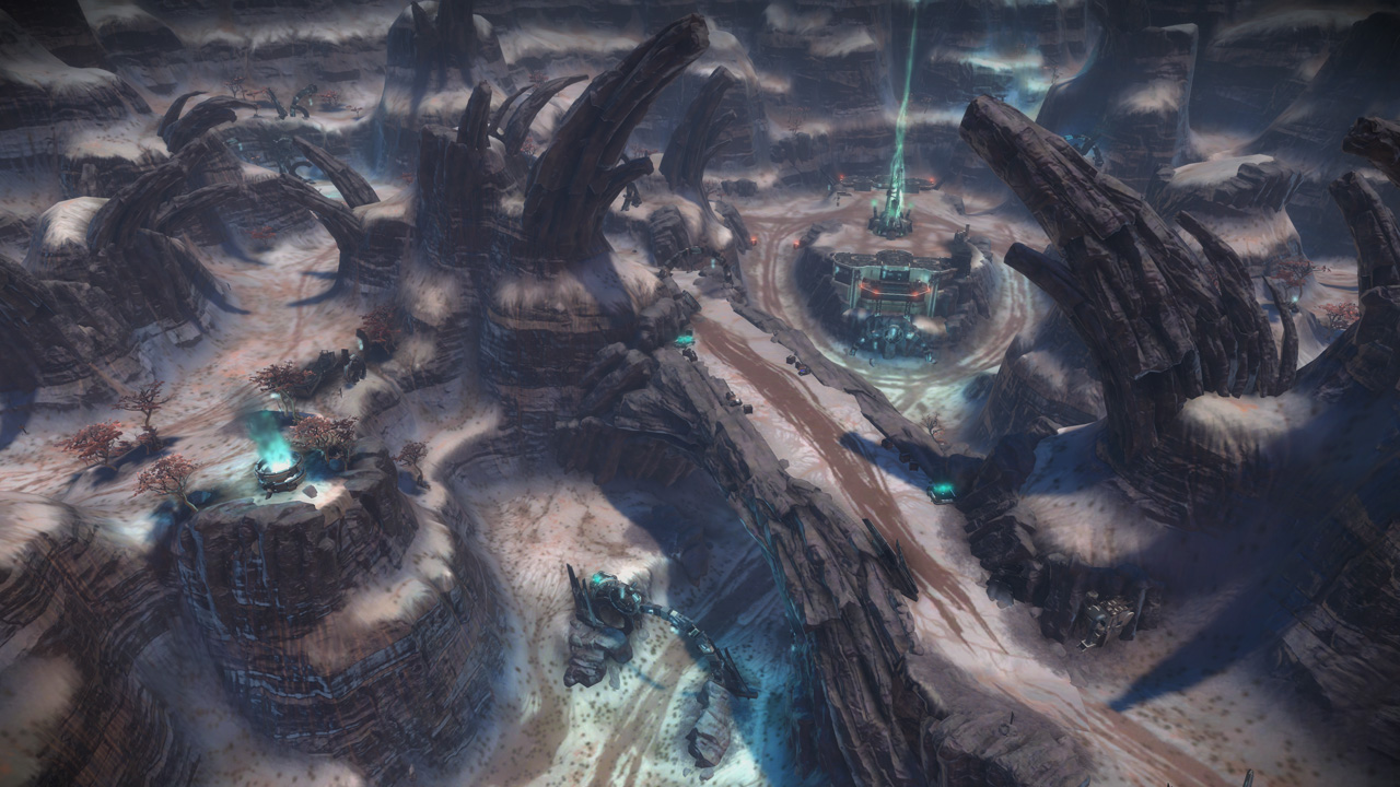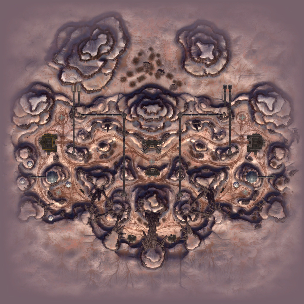 My intention had always been that the east ridge would feature heavier man-made structures compared to more natural low-lying areas to the west. I temporarily borrowed the "Ballard's Crossing" space elevator from the single player campaign to provide a visual anchor to the top of the central plateau, but this never quite came together as strongly as I'd hoped.