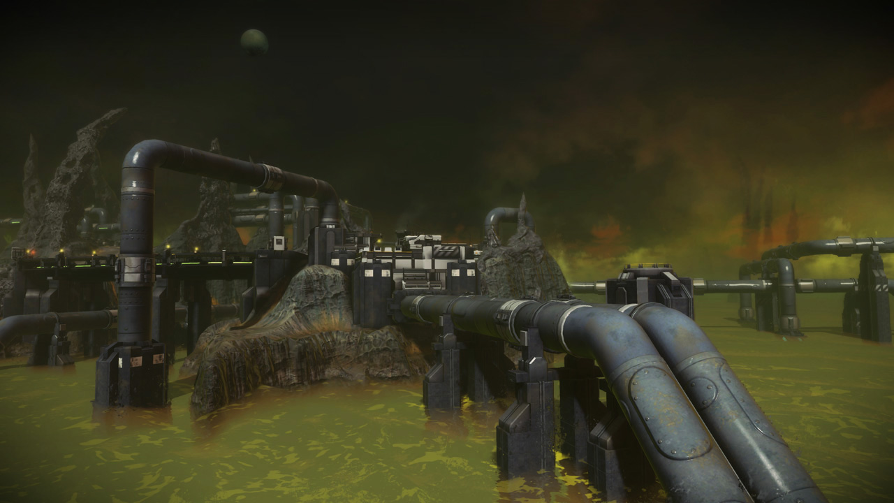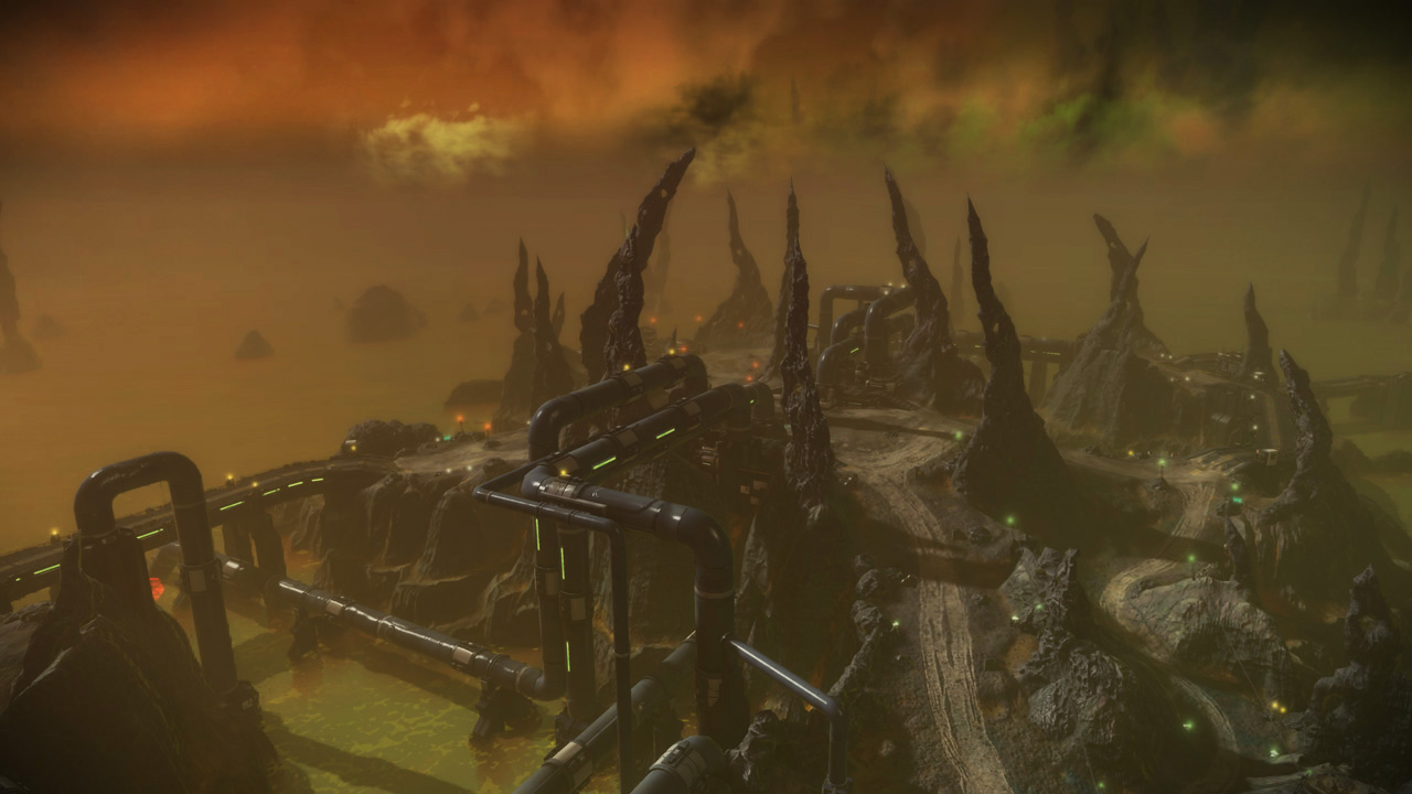 Conduit, set in the "Acid Sea" environment of Dust's moon Scourge, was the general public's first glimpse of Starhawk's multiplayer. The level debuted to the press at our unveil event at the Alamo Drafthouse Ritz in May 2011 and then to the general public at E3 2011. Conduit was also included in both phases of the Starhawk beta that kicked off in late 2011.