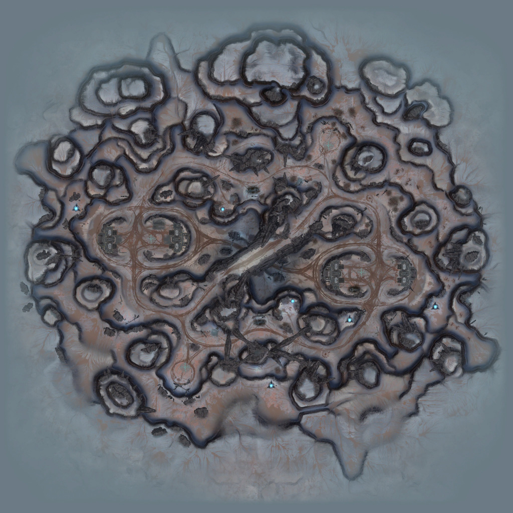 Where Hollow used flat terrain islands, Fracture's massive islands are all rotated off-kilter, adding extra challenge to developing the World Machine layout. To offset this, I used the same approach I used on Hollow to generate the cracked look and instead created large outcroppings sloped such that they would be roughly "flat" when applied to the island as placed in-game. Both teams' bases sit on the edge of massive outcrops at either end of the map, creating an imposing approach from the bottom and once again resulting in impressive vehicle jumps on the way out.