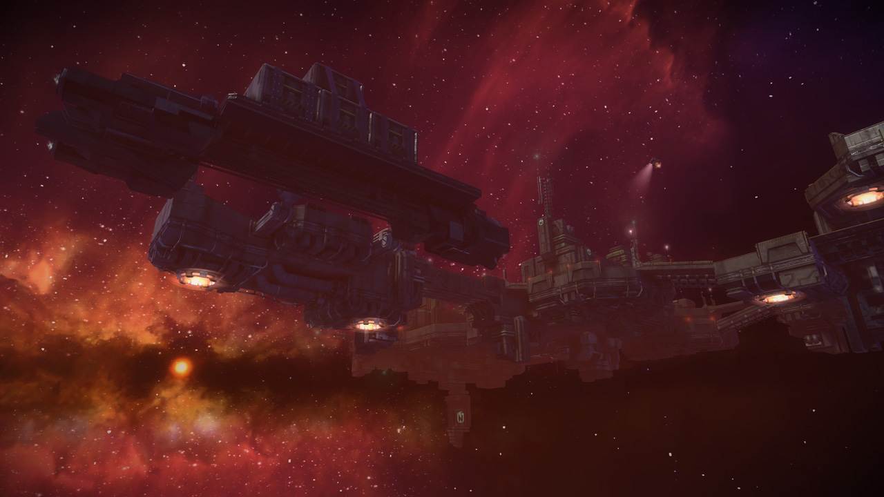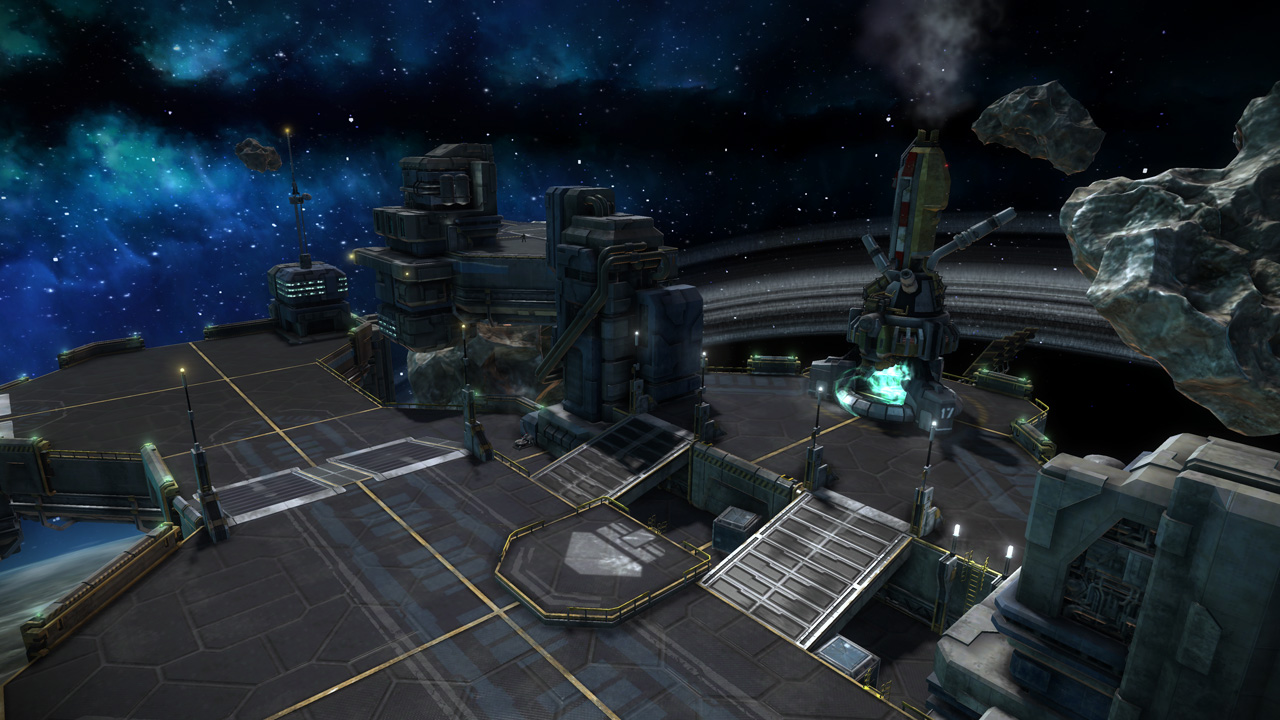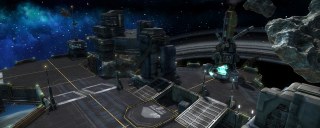 Starhawk's space levels were interesting beasts to construct. Unlike the terrestrial levels, which relied on terrain rendered in World Machine, our space levels were constructed from individually-placed platform meshes. This was a double-edged sword; editing and iteration became much easier without the need for tedious rendering and conversion, but were hell on object count and performance. This resulted in smaller, more compact layouts - the space levels ended up being the smallest levels in the shipping game.