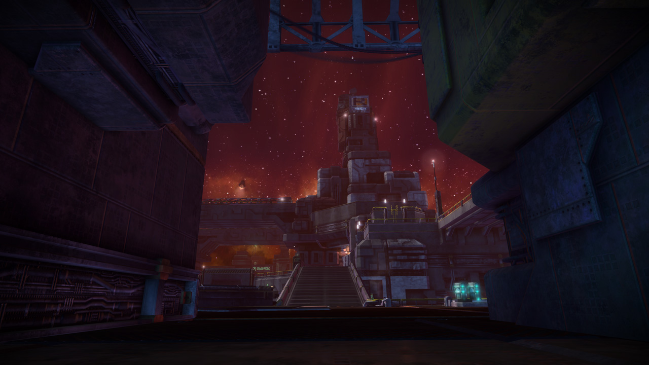 This was actually the second attempt at an Acid Sea-themed multiplayer level. The first was the layout that would eventually become Cove, which was deemed too large for sixteen-player servers in our unveil and early stages of the beta. Conduit's layout focuses around a large land mass with a central plateau, providing a key midground for CTF play. The side islands connected by bridges provide alternate routes (and additional rift locations for Zones).