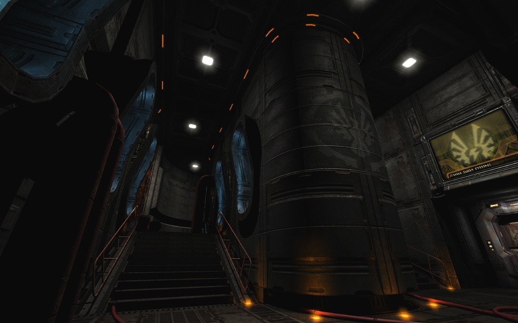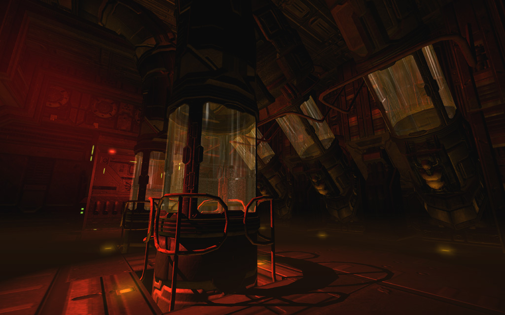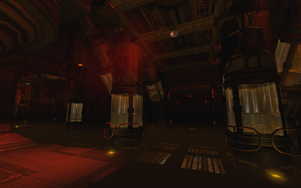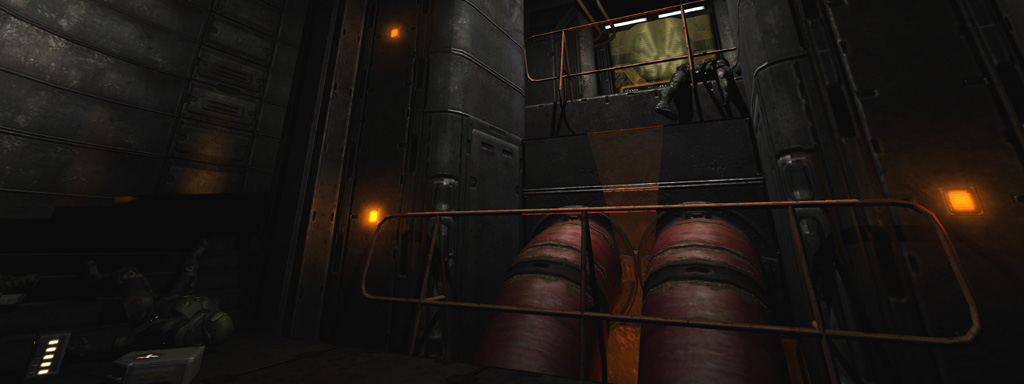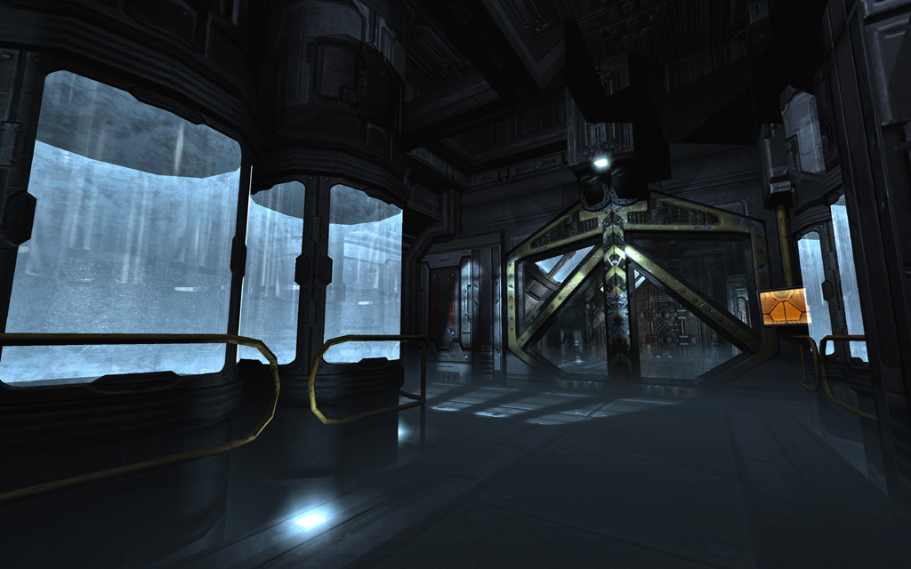 To play up the 'out of commission' feel for the first pass through the level, I picked a deep yellowish base tone highlighted with spinning red emergency lights and flashing yellow accent lights on the floor. To further ground the level's colors, I added a thin yellow ground fog to simulate haze illuminated by the floor lights, and also gave every piece of glass a subtle dark yellow tint that blended nicely with the texture's normal map and cubemap.