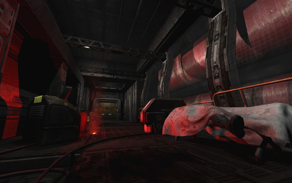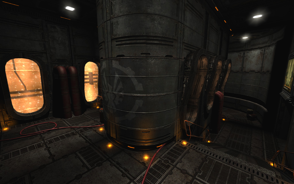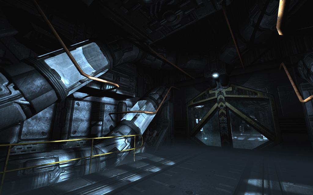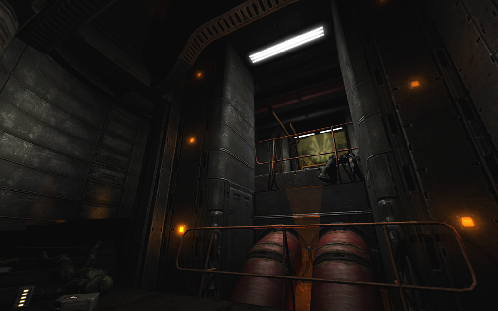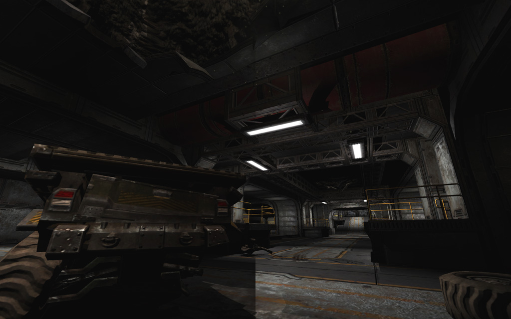 To play up the 'out of commission' feel for the first pass through the level, I picked a deep yellowish base tone highlighted with spinning red emergency lights and flashing yellow accent lights on the floor. To further ground the level's colors, I added a thin yellow ground fog to simulate haze illuminated by the floor lights, and also gave every piece of glass a subtle dark yellow tint that blended nicely with the texture's normal map and cubemap.