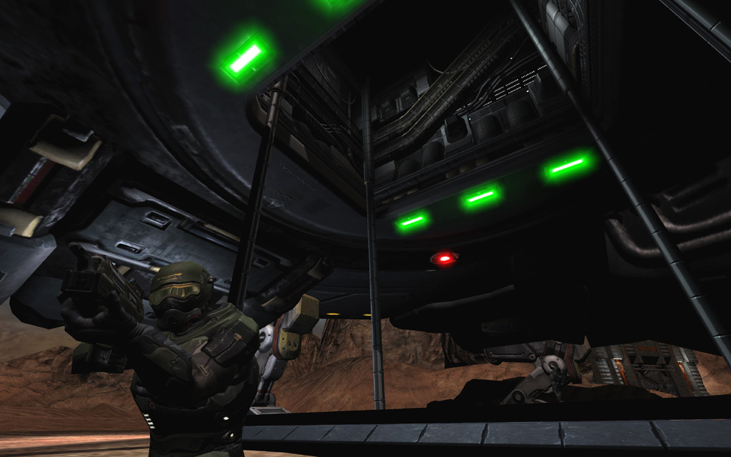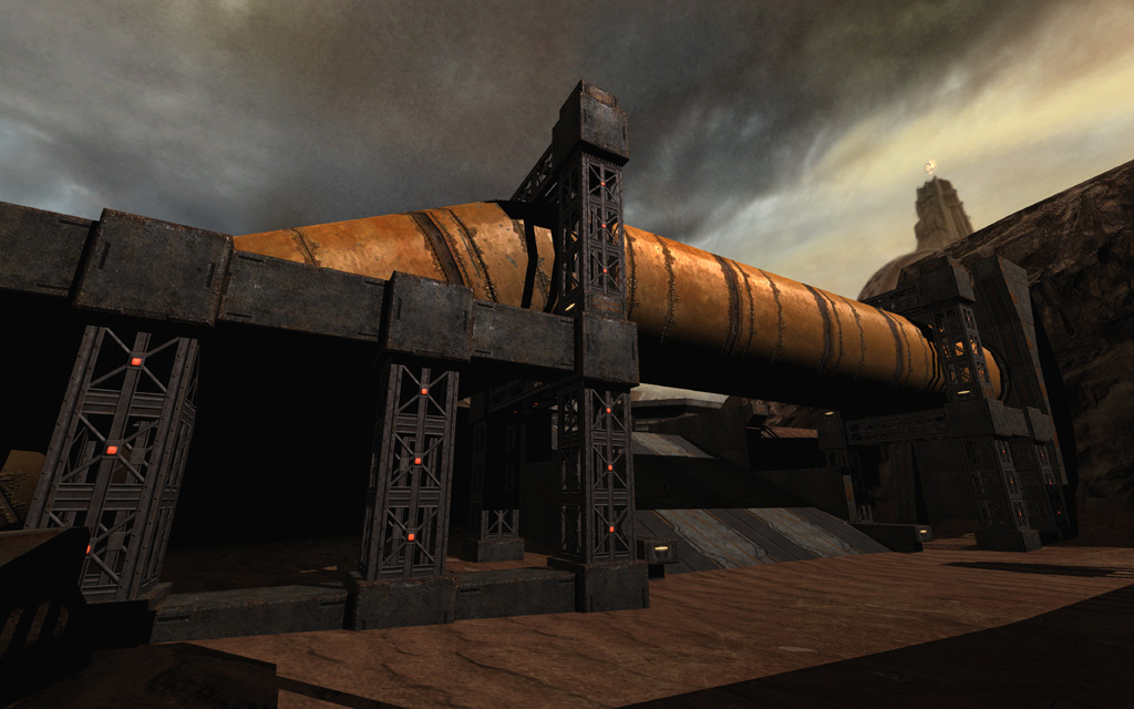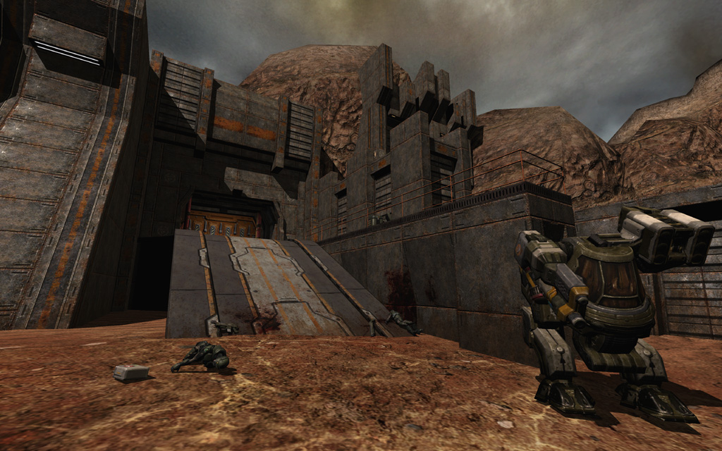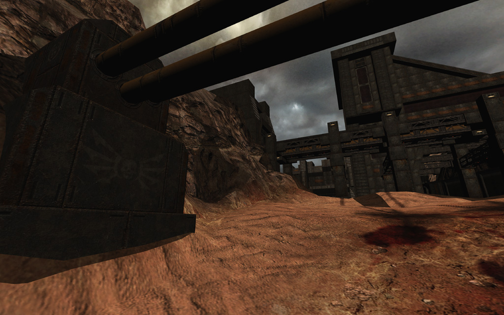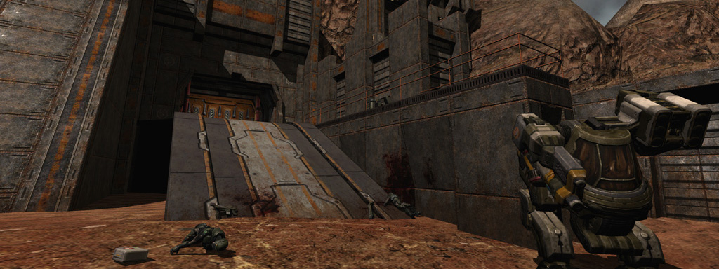 MCC Landing Site bridges the gap between the Strogg Hangars and the first briefing aboard the Marines' command ship, the Hannibal. Most of the geometry of this level is merged from the levels preceding it and following it; the level starts with a non-combat section in the now Marine-controlled Hangar Perimeter, then transitions back to Air Defense Trenches (Corey Peters), which itself incorporates geometry from the level Convoy that follows (Mike Renner). Of the content unique to this level, I was responsible for building and scripting the encounter space under the Strogg air defense cannon, while Roger Cordes constructed the open terrain landing site at the end of the level.