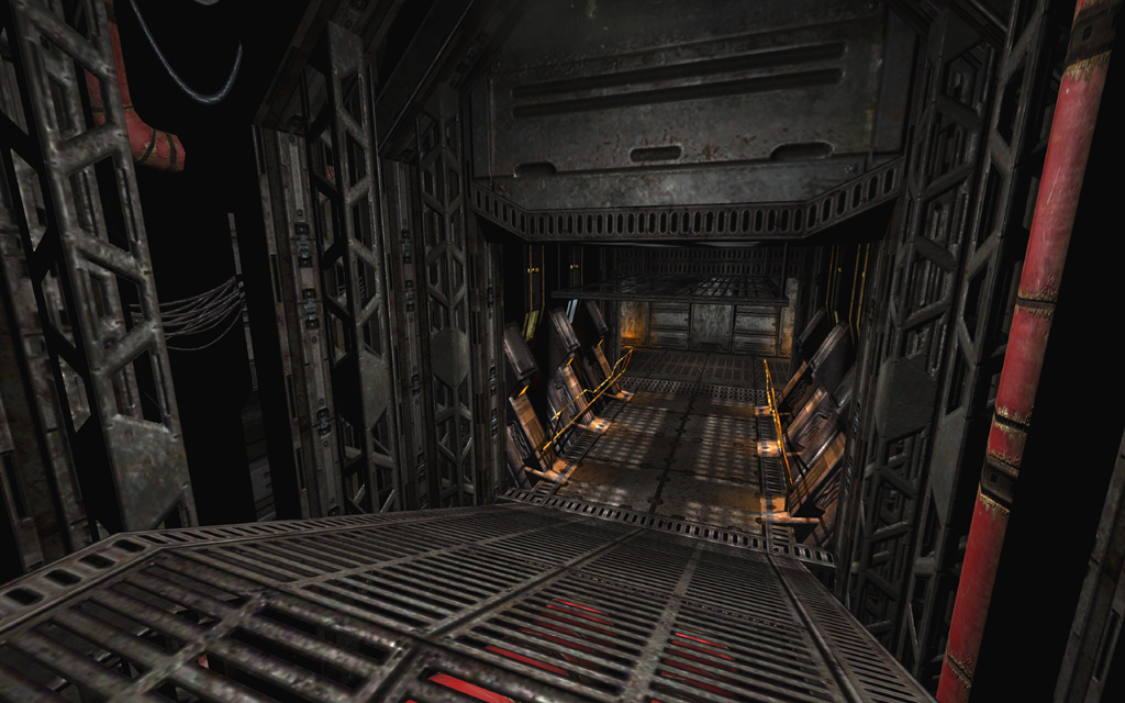 Like Hangar Perimeter, I took over Interior Hangar from original designer Bob Bettenberg and was responsible for the level through the end of development. The level was in similar shape as the first Hangar level when I came aboard, with its layout generally intact but in need of a visual, scripting, and combat pass.
