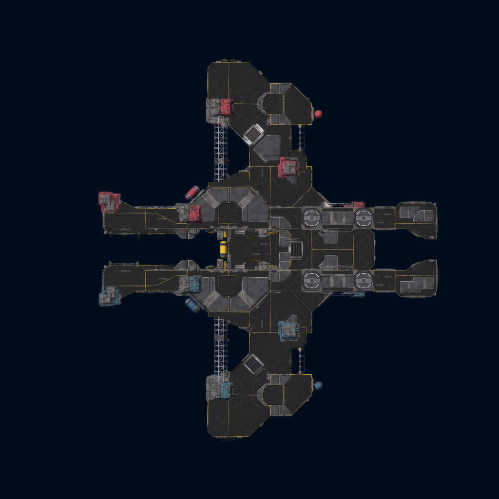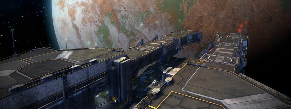 I first started poking at Relay during some downtime shortly after Starhawk launched; the space environment was easy to get up and running in new layouts due to its extremely modular nature. I started with the core of the level and the twin arms extending out over the midground (invoking some of Apogee's stylings) mixed with a dash of a tuning fork and some inspiration from Homeworld's Bentusi ships.