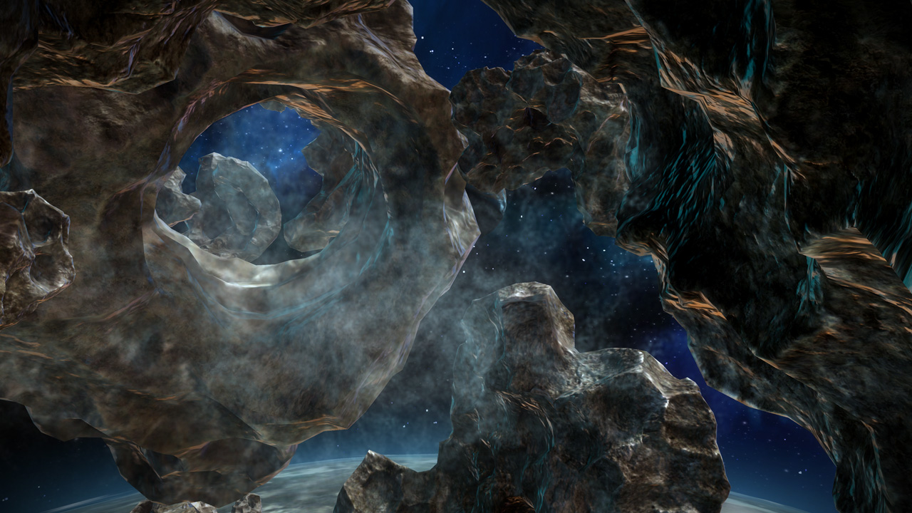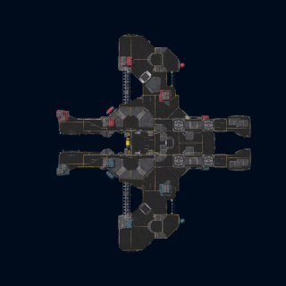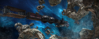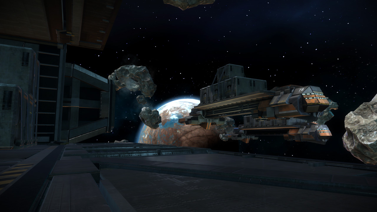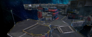 Immediately after Starhawk shipped, I decided to remedy that. I started by stretching the giant "space train" across the middle of the level, then added nearby clusters of freighters. Once these were in place, I went all-out on the asteroid field motif, with emphasis on creating clusters to steer players towards pickups and encourage certain chase routes. Flotilla is by far the largest level in the game, making it ideal for hectic dogfights on packed servers.
