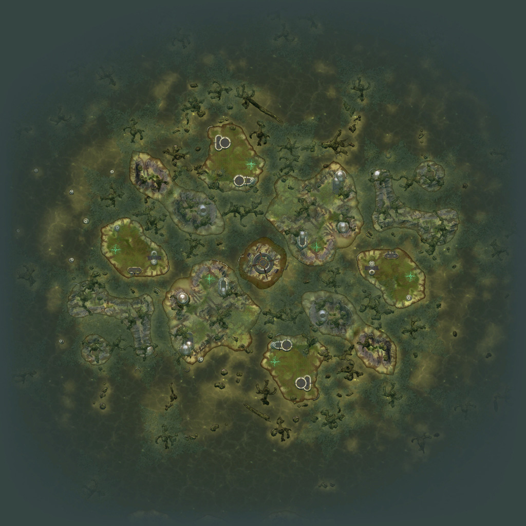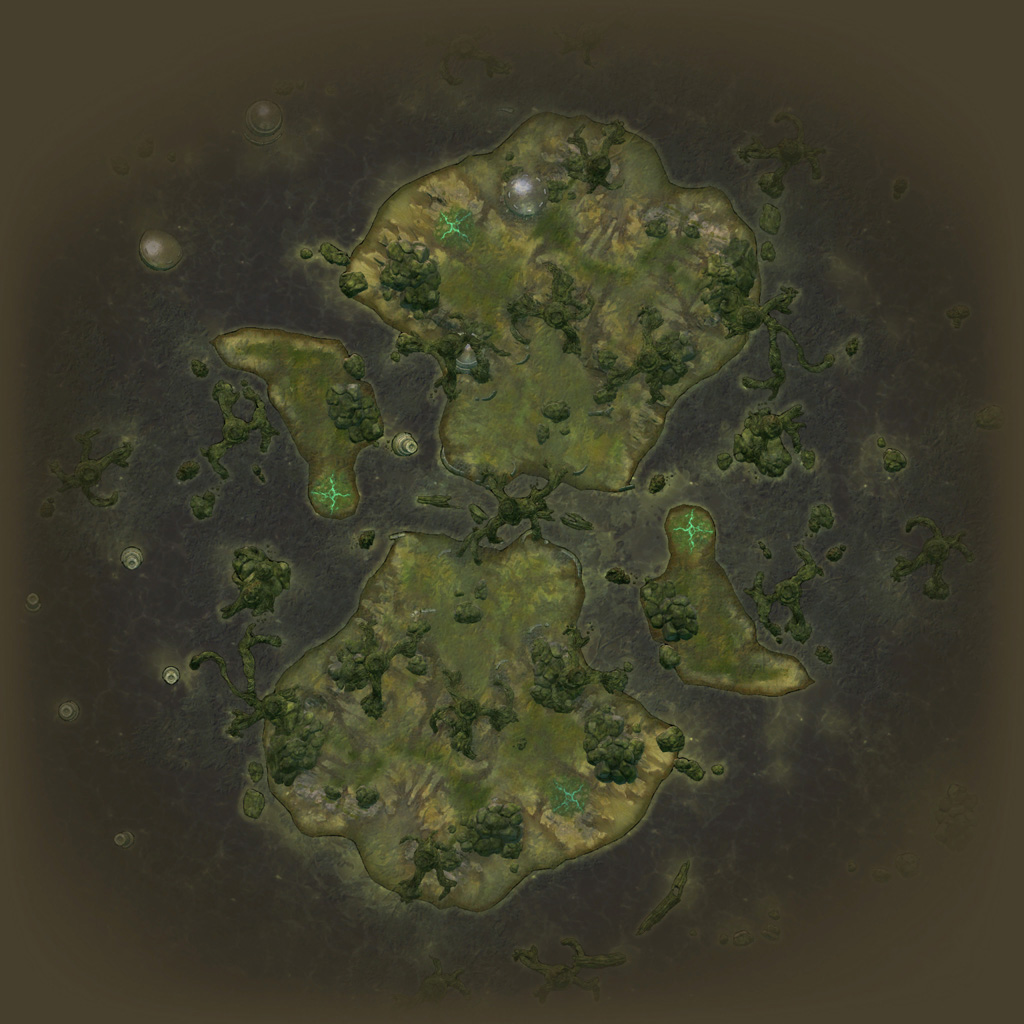 Cypress terrain was constructed much like our Sever levels, with a sheet of World Machine terrain broken up into individual islands. This time I was very conscious of the terrain scale issues from before, and focused on laying out much smaller islands to assemble these layouts. The smaller scale helped keep the level's size in check (Origin is closest in size to Outlands), and helped create entertaining routes through the ankle-deep water filling the low-lying areas of the level. Origin also features denser and more chaotic rift placements in Zones, hosting six rifts in a relatively small space.