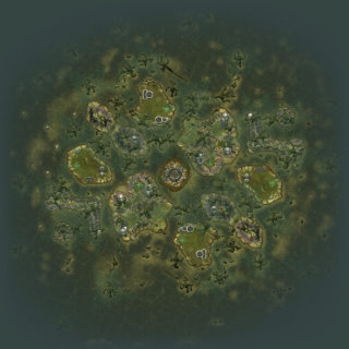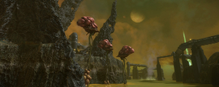 One of my favorite touches in the Cypress skydomes was a cluster of rock pillars painted into the back of the skydome. This always gave me images of what a level might look like set there, and invoked immediate thoughts of Warhawk's classic level Archipelago. In the absence of doing such a level, I used stacks of the rock meshes we already have to emulate that style at Glade's outer boundary, giving the appearance of rock monoliths gradually rising from the swamp.