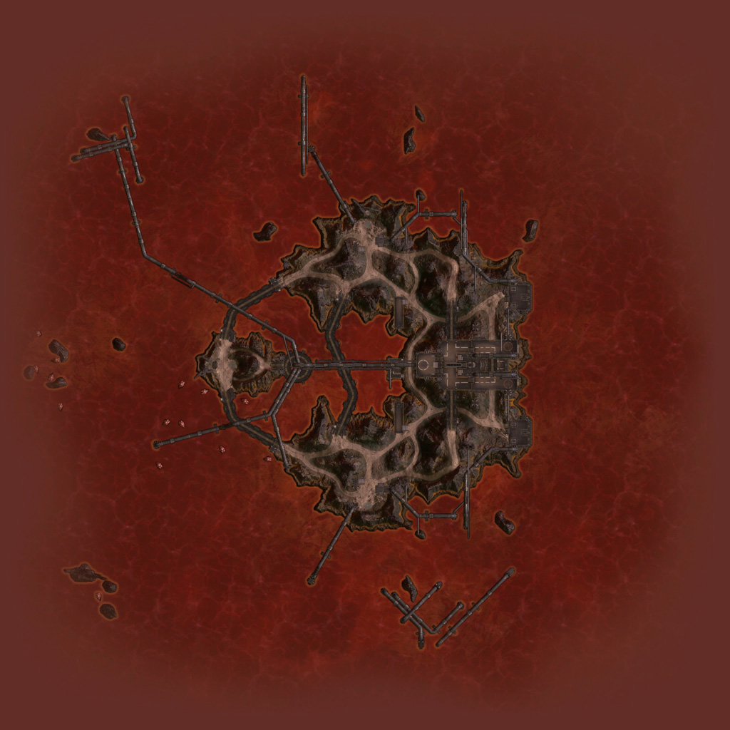 This was actually the second attempt at an Acid Sea-themed multiplayer level. The first was the layout that would eventually become Cove, which was deemed too large for sixteen-player servers in our unveil and early stages of the beta. Conduit's layout focuses around a large land mass with a central plateau, providing a key midground for CTF play. The side islands connected by bridges provide alternate routes (and additional rift locations for Zones).
