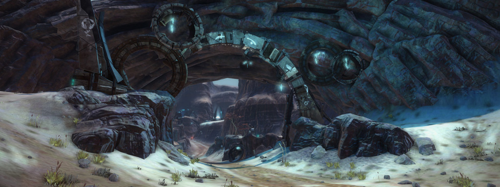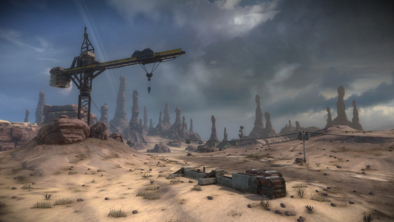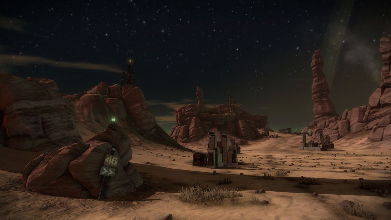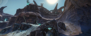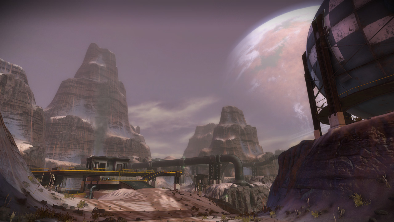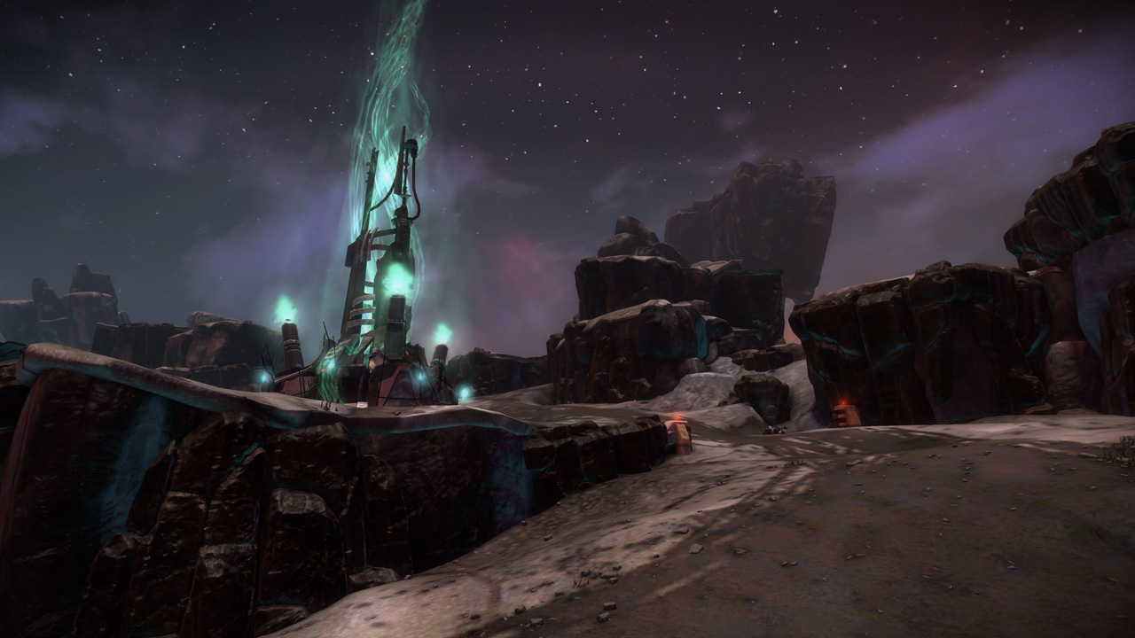 My intention had always been that the east ridge would feature heavier man-made structures compared to more natural low-lying areas to the west. I temporarily borrowed the "Ballard's Crossing" space elevator from the single player campaign to provide a visual anchor to the top of the central plateau, but this never quite came together as strongly as I'd hoped.