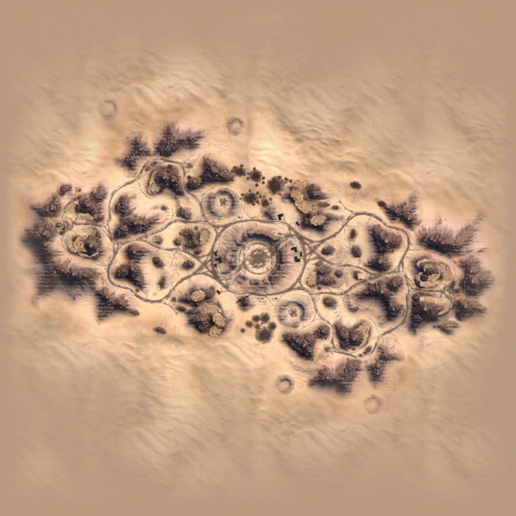We went back and forth a bit on how to construct the terrain layout itself; I was able to work up a way to lay out large cracks in the terrain, which Jonny then fleshed out and detailed in the final terrain pass. This cracked look helped create Hollow's low-lying slot canyons as well as ramps allowing vehicles to jump over the gap in between.