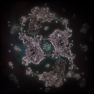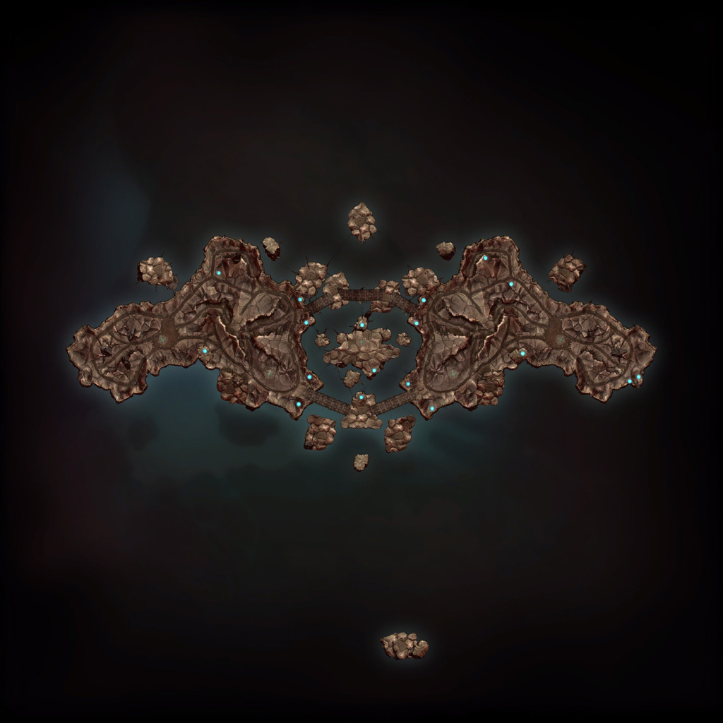 Where Hollow used flat terrain islands, Fracture's massive islands are all rotated off-kilter, adding extra challenge to developing the World Machine layout. To offset this, I used the same approach I used on Hollow to generate the cracked look and instead created large outcroppings sloped such that they would be roughly "flat" when applied to the island as placed in-game. Both teams' bases sit on the edge of massive outcrops at either end of the map, creating an imposing approach from the bottom and once again resulting in impressive vehicle jumps on the way out.
